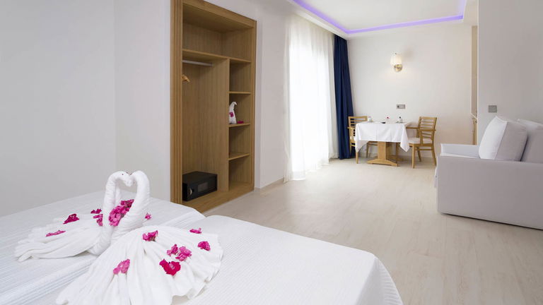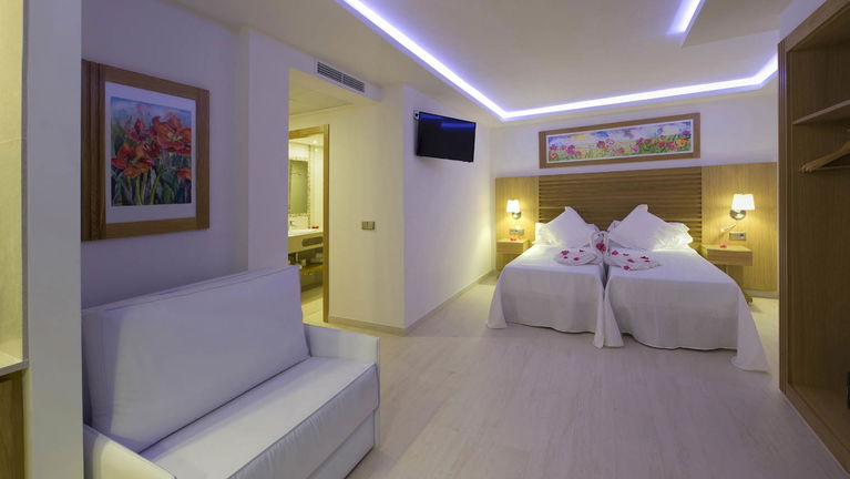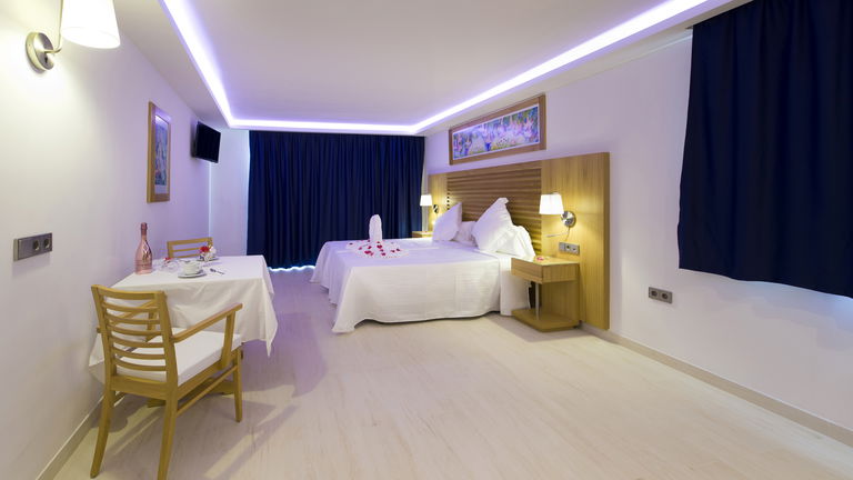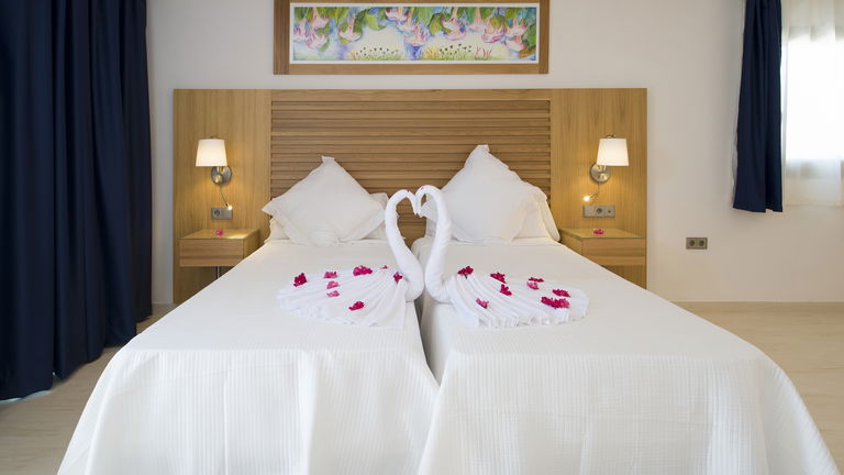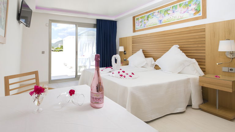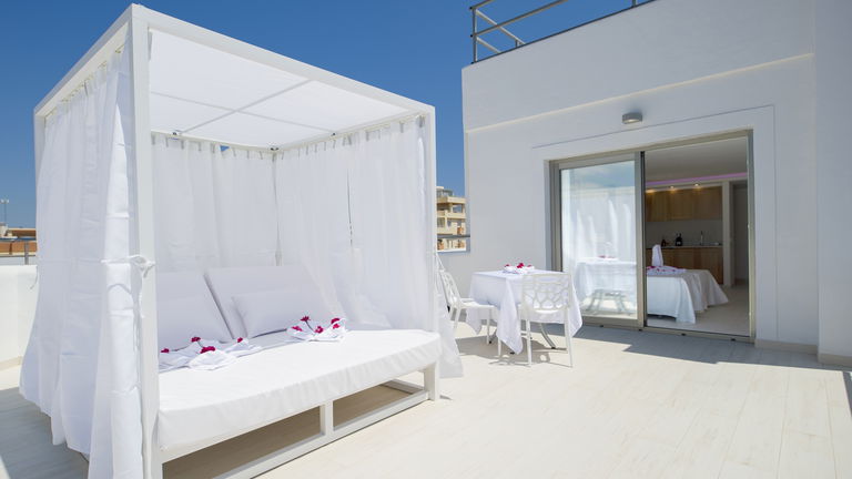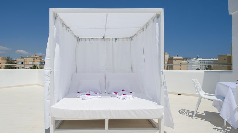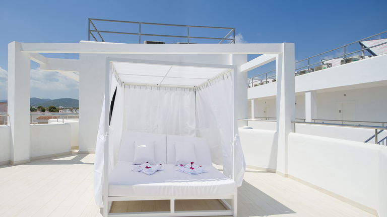 DELUXE CON CAMA BALINESA.- Adéntrese en la cultura ibicenca en nuestra habitación más exclusiva. La luminosidad y el gran espacio caracterizan la habitación. El acceso directo a una gran terraza con cama balinesa le permitirán disfrutar de la brisa marina y del sol. Reservándola tendrá acceso a una de las camas balinesas de la piscina. Este acceso será bajo reserva y atendiendo a disponibilidad.